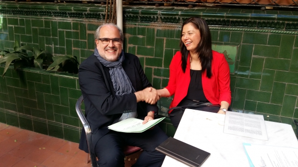 A la foto, el cap de servei de la Societat del Coneixement, Ricard Faura, i l'administradora de Centdintel, Andrea Acuña, durant la signatura de l'acord.