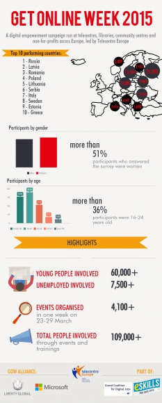 Des de la primera campanya, al 2010, la Get Online Week ha sumat més 160.000 de nous usuaris d'Internet i més de 12 milions d'europeus han sentit parlar de la importància de la capacitació i el gran treball realitzat en els telecentres. En aquesta infografia podeu veure els resultats concrets de l'edició d'enguany: