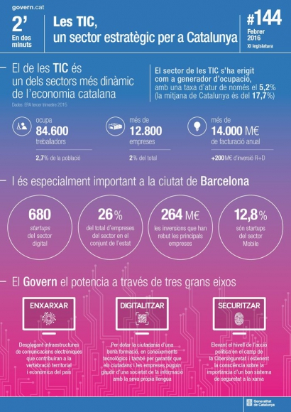 Segons es desprèn d’aquestes dades, el de les TIC és un dels sectors més dinàmics de l’economia catalana. Amb més de 12.800 empreses (xifra que representa un pes relatiu de gairebé el 2% del total d’empreses catalanes), més de 14.000 milions d’euros de facturació anual i més de 200 milions d’euros destinats anualment a inversió en R+D, és un motor de creixement que genera riquesa i ocupació de qualitat. El sector concentra el 70% de la seva activitat al voltant de la ciutat de Barcelona.