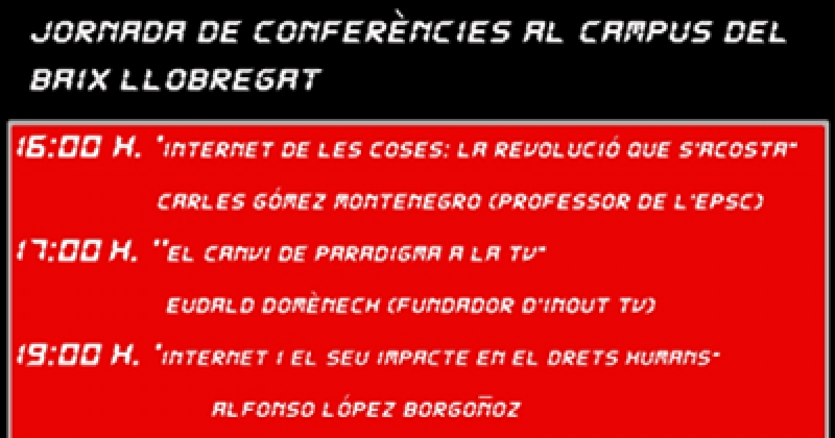 L'Escola Politècnica Superior de Castelldefels (EPSC) organitza unes conferències de 16:00 a 20:00 hores del dilluns: “Internet de les coses: la revolució que s’acosta” a càrrec de Carles Gómez, professor de l'EPSC i membre actiu de l'IETF (The Internet Engineering Task Force); “El canvi de paradigma a la TV”, Eudald Domènech, pioner d'Internet i fundador d'InOut TV; “Internet i el seu impacte en la defensa dels drets humans”, Alfonso López, president d'Amnistia Internacional Espanya.