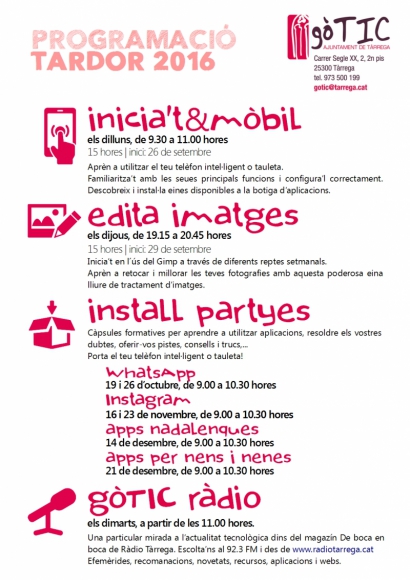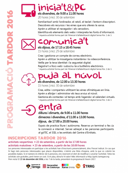 El registro se realizará de forma presencial en el local y por estricto orden de llegada. Entre las propuestas encontrará talleres de comunicación, iniciación a la informática, instalación y uso de aplicaciones móviles o edición de imágenes, entre otros. Todas las actividades comenzarán la última semana de septiembre.