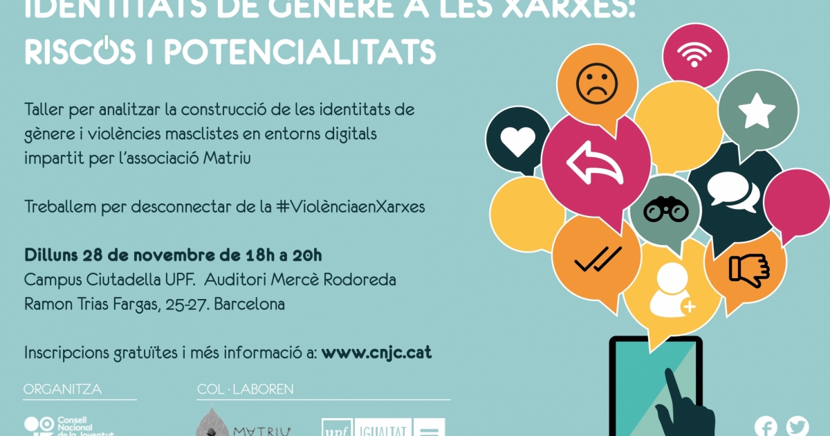 El Consell Nacional de la Juventut de Catalunya (CNJC) impulsará con motivo del 25N, Día Internacional contra la Violencia hacia las Mujeres, la campaña "Desconéctate de la violencia". El taller-debate "Identidades de género en las redes: riesgos y potencialidades" se enmarca dentro de esta iniciativa. Tendrá lugar el 28 de noviembre, de 18.00 a 20.00 horas, en el Campus Ciutadella de la Universidad Pompeu Fabra (Auditorio Mercè Rodoreda), Barcelona.