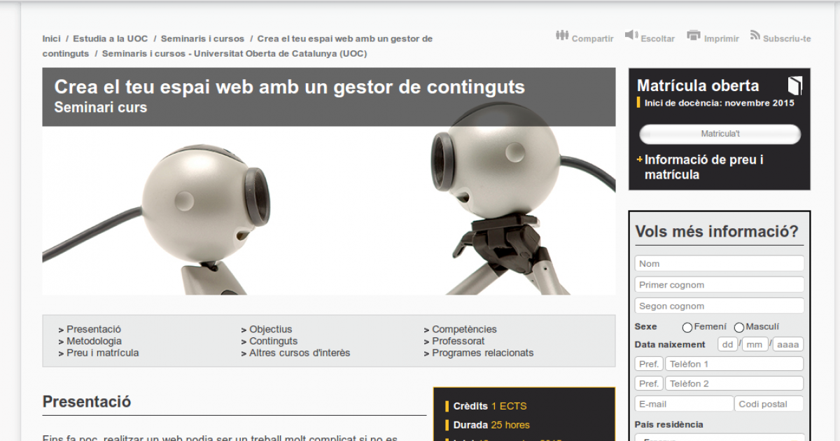 Aquesta és una proposta de formació Online a la UOC (Universitat Oberta de Catalunya). Amb Jordi Solé Mercadé, expert en Gestors de continguts, veurem a fons com aquestes eines faciliten l'actualització i el manteniment de la web.